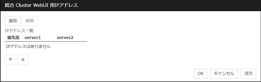 インタコネクトを複数設定する場合、[優先度] 列の番号が小さい通信経路が優先的にクラスタ サーバ間の内部通信に使用されます。優先度を変更する場合は、矢印をクリックして、選択行の順位を変更します。