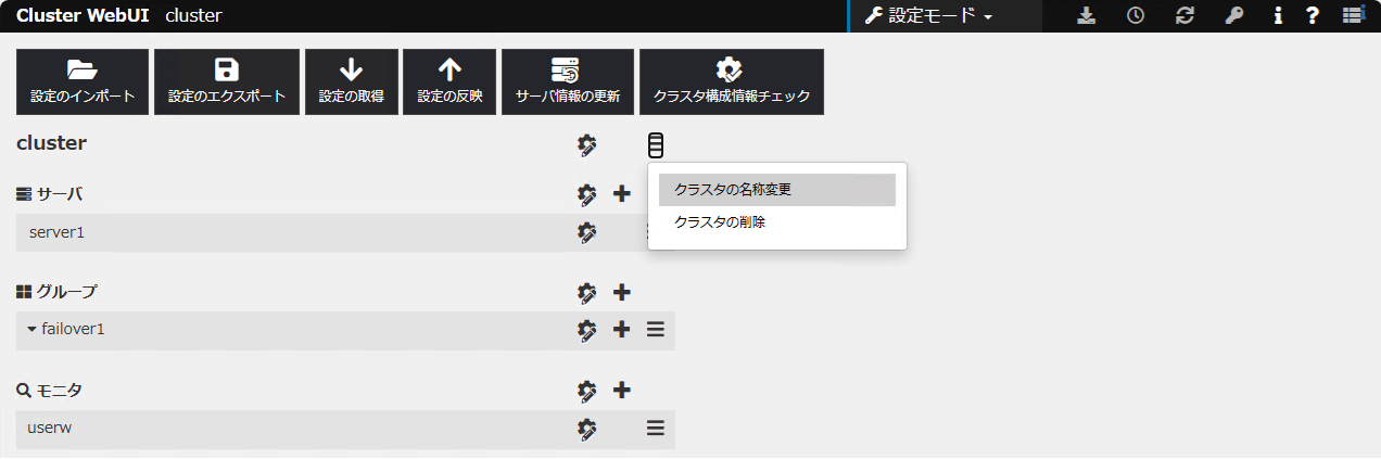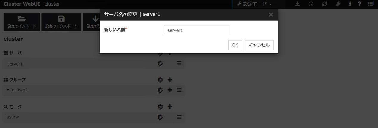 クラスタ名を表示します。ここでは名前の変更はできません。