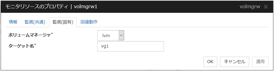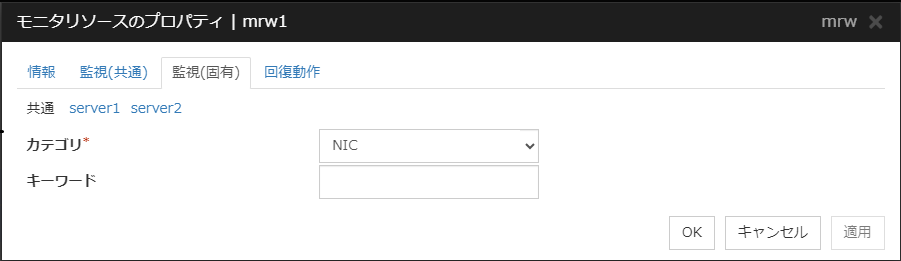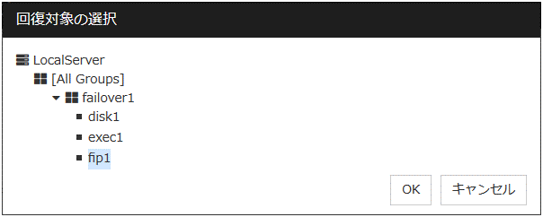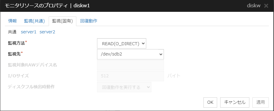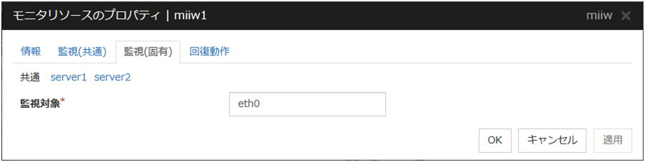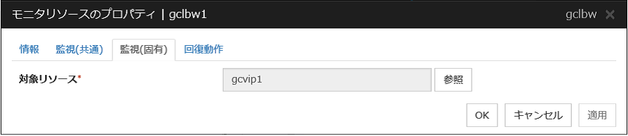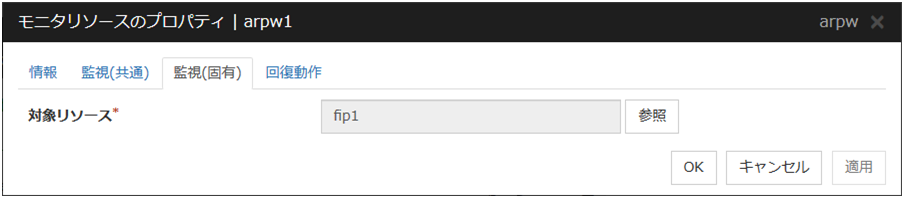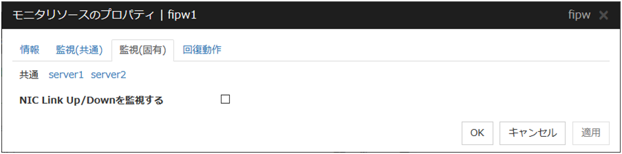 チェックボックスがオン(既定)フェイルオーバグループが起動しているサーバから登録した IP アドレスが仮想ホスト名(DNS 名)の名前解決によって得られるかを確認します。 チェックボックスがオフ監視しません。