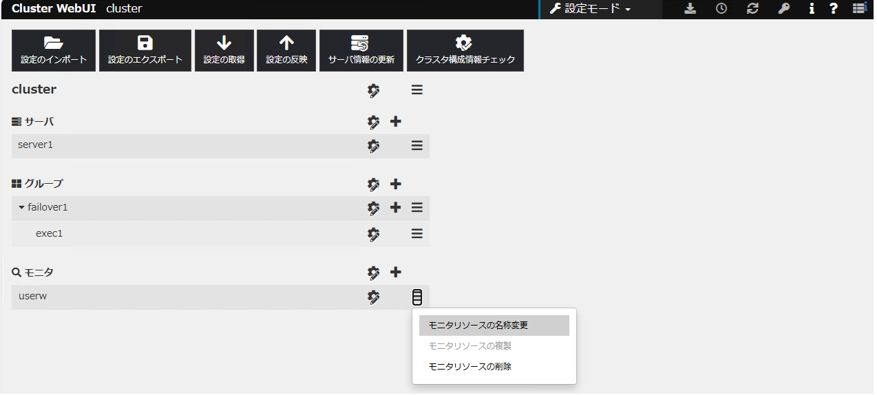 モニタリソースとは、指定された監視対象を監視するリソースのことを指します。監視対象の 異常を検出した場合には、グループリソースの再起動やフェイルオーバなどを行います。