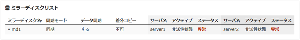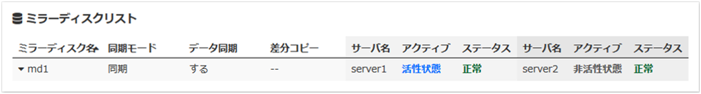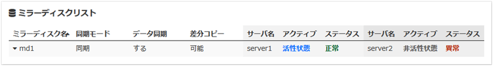 Cluster WebUI のミラーディスクリストからミラー復帰処理の実行状態を確認します。(下記の例はミラーディスクリソースの場合です。ハイブリッドディスクリソースの場合には、画面の表示が異なりますが、ステータスの意味、説明は同じです。)