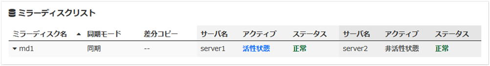 clpmdstat --mirror <ミラーディスクリソース名 (例:md1)>ハイブリッドディスクの場合:
