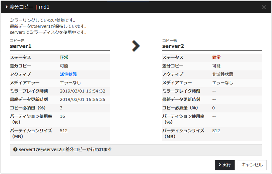 復帰が必要なサーバの[差分コピー]または[フルコピー]をクリックし、[実行] をクリックするとミラー復帰が実行されます。