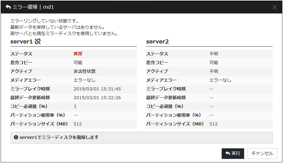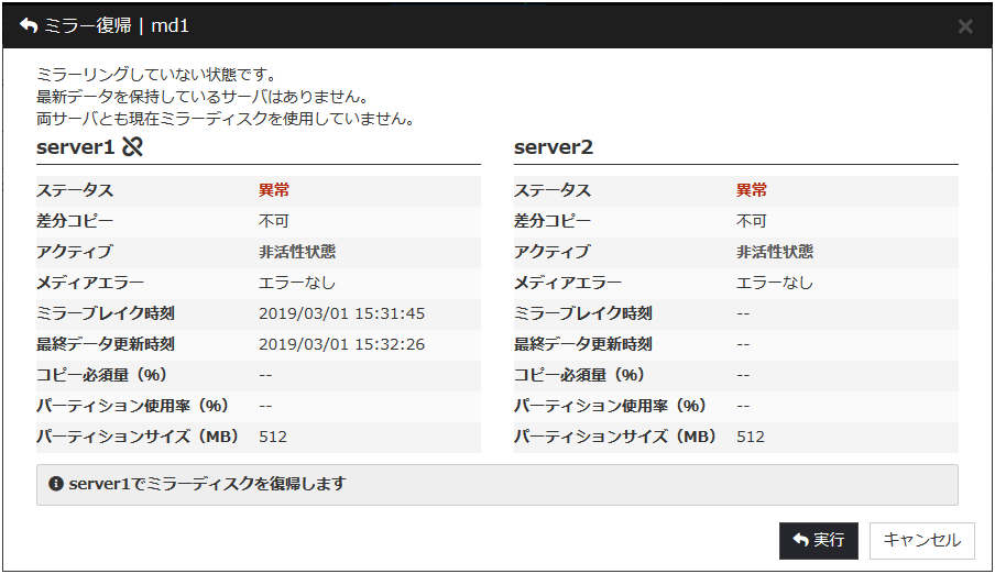 最新のデータを保持しているサーバの [強制ミラー復帰] をクリックすると、下記のような画面に変わります。 [実行] をクリックするとミラー復帰が実行されます。