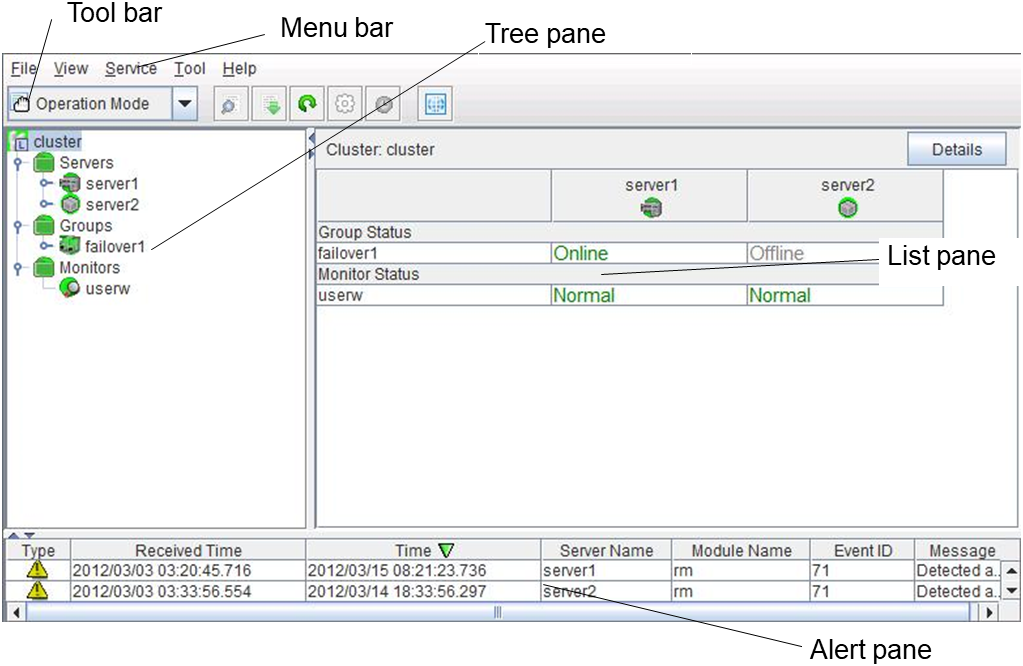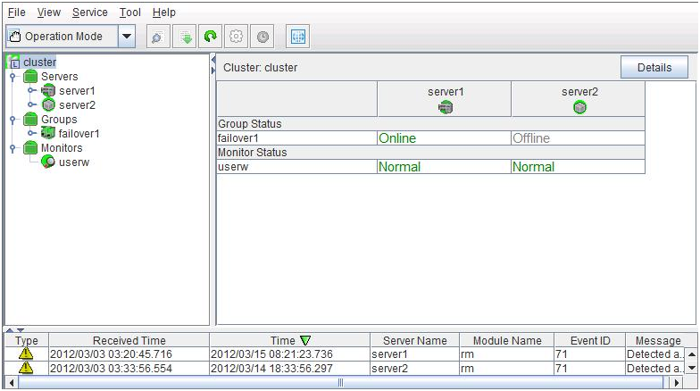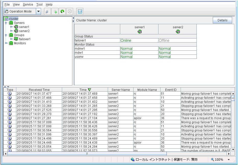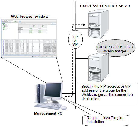 The WebManager is a function for setting up the cluster, monitoring its status, starting up or stopping servers and groups, and collecting cluster operation logs through a Web browser. The overview of the WebManager is shown in the following figures.