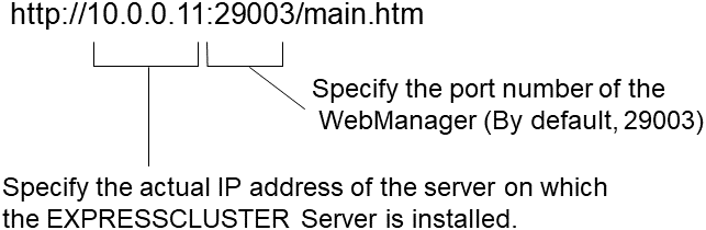 - Enter the actual IP address and port number of the server where the EXPRESSCLUSTER Server is installed in the Address bar of the browser.