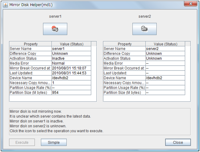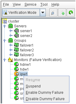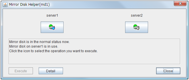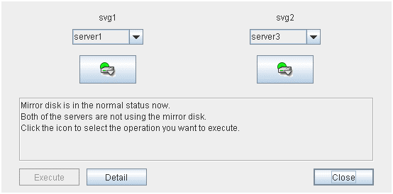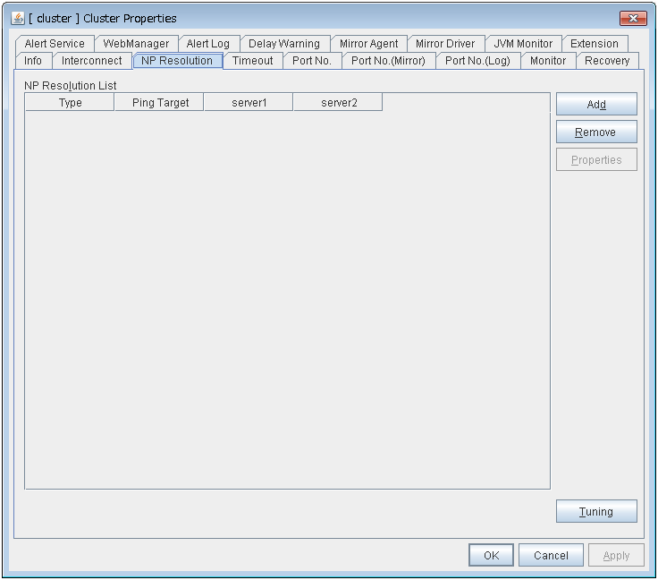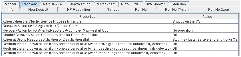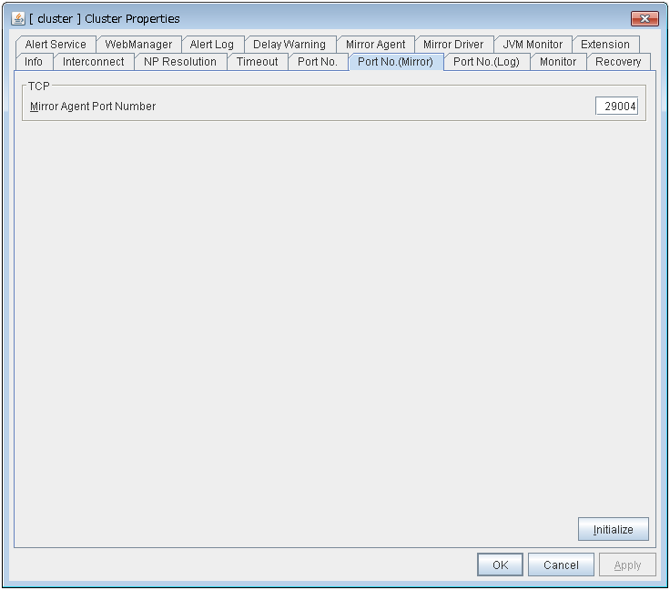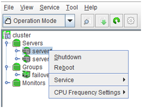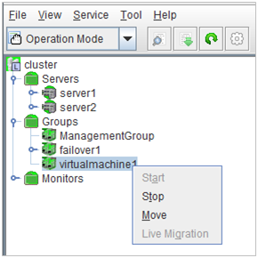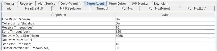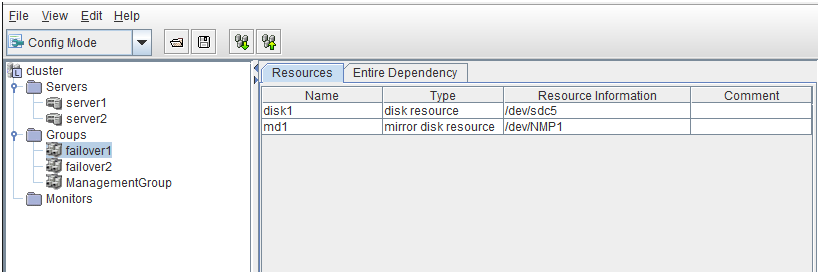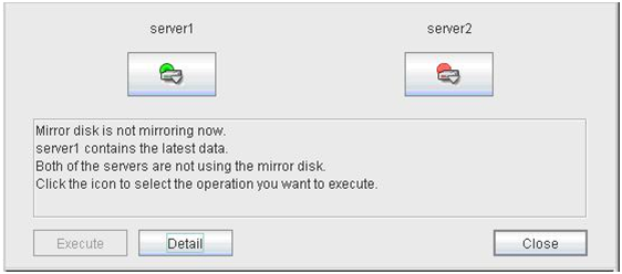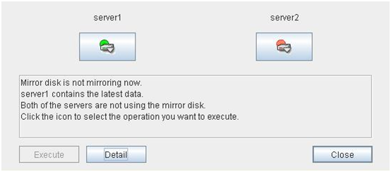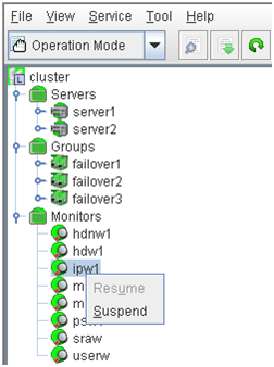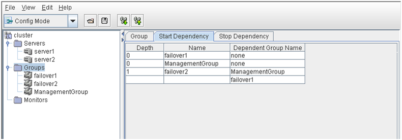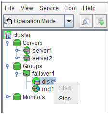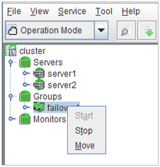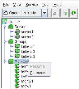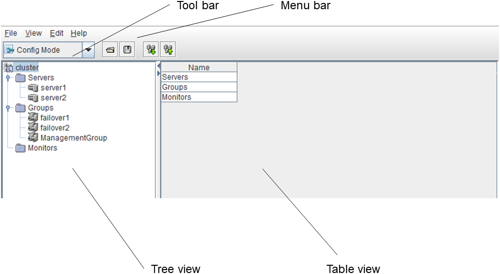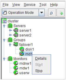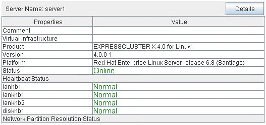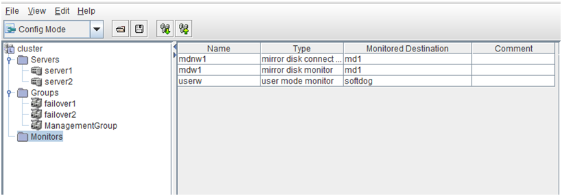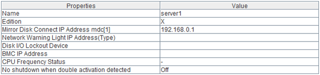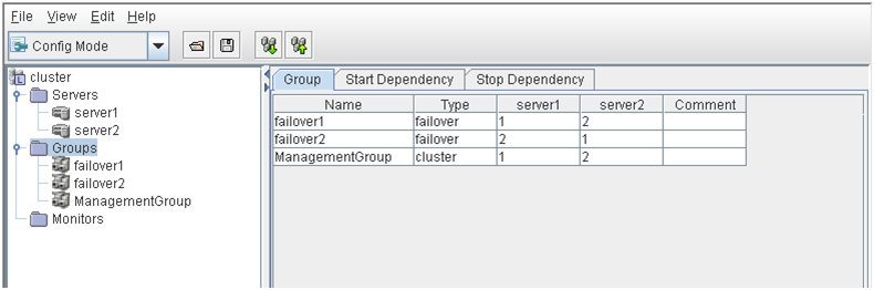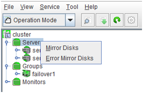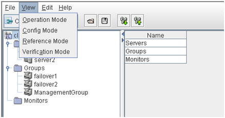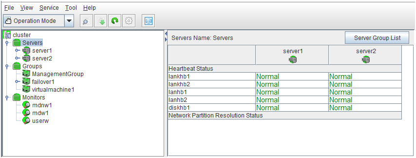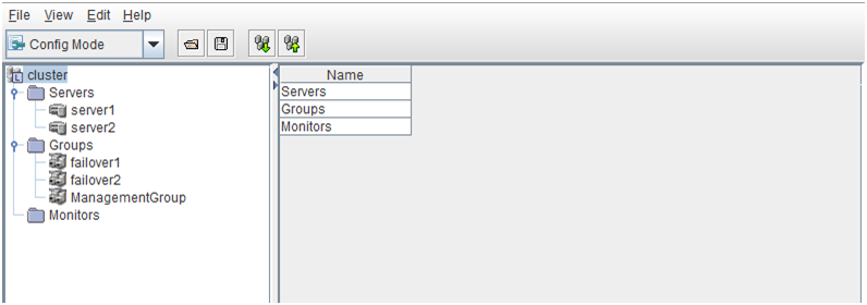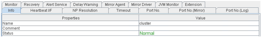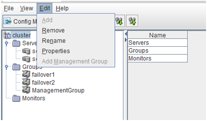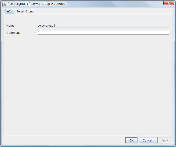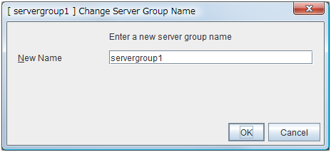 - There are naming rules that are the same as the host name of TCP/IP that can be set by the OS.- Up to 31 characters (31 bytes).- Names cannot start or end with a hyphen (-) or a space.- A name consisting of only numbers is not allowed. Cluster stopMirror agent stopMirror agent startCluster startNames should be unique (case-insensitive) in the server group. PropertiesDisplay the properties of the selected server group. NameDisplay the server group name. ServersDisplay the server names which belong to the server group.