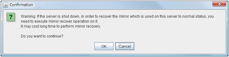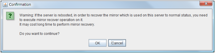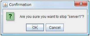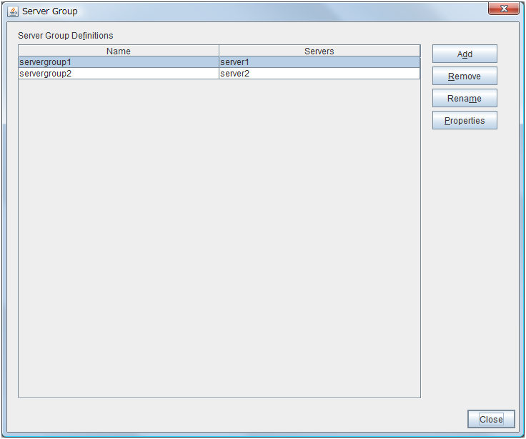AddAdd server groups. The wizard windows for adding the server group is displayed. RemoveThe confirmation dialog box is displayed. When removing, select Yes. Then the selected server group is removed. When not removing, select No.When the following conditions are matched, the server group cannot be removed.