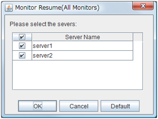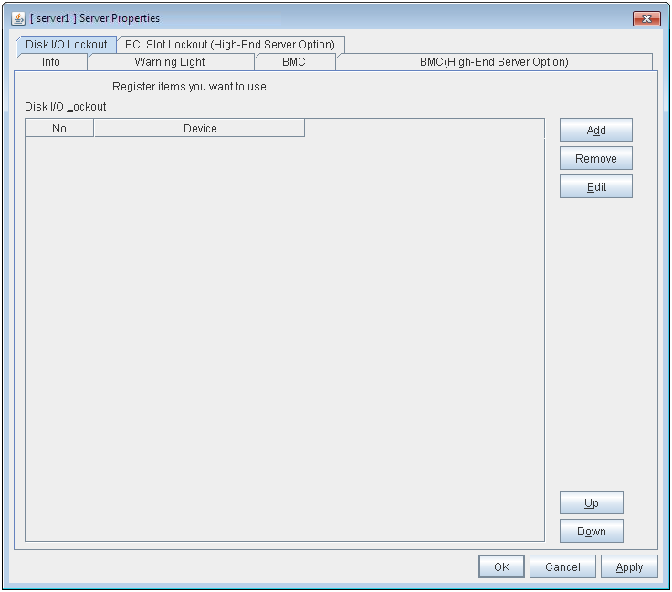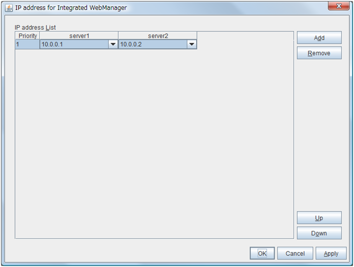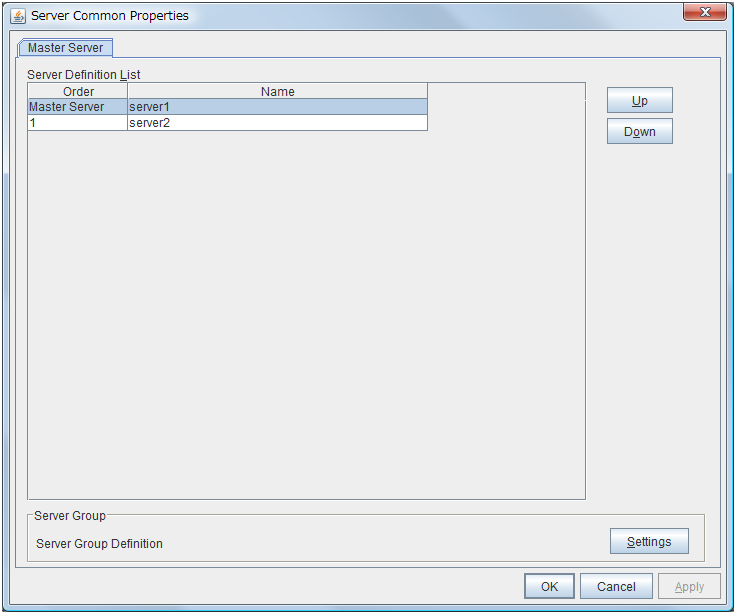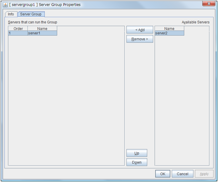 Used when changing the priority order of the server. Select the server to be changed from Servers that can run the Group and click Up or Down. The selected row moves.