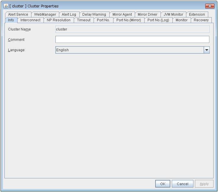 For the language used on the screen, see "3.11. Cluster properties 3.11.1. Info tab" in "3. Functions of the Builder" in this guide.