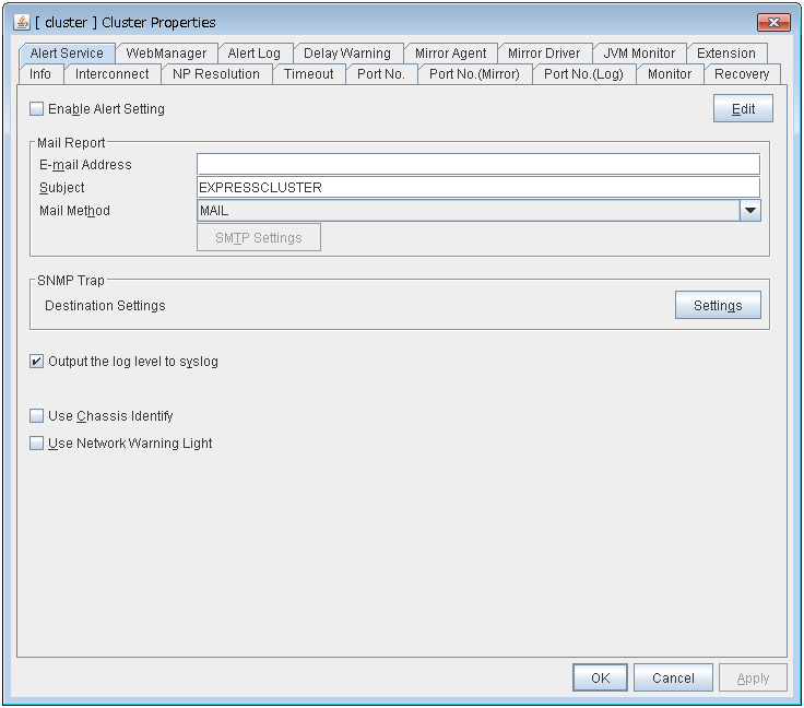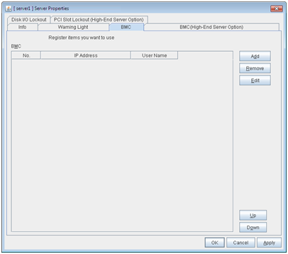 Use this button to modify the settings. Select the target setting, and then, click Edit. The BMC Settings dialog box is displayed.When a cluster consists of the different types of servers and includes a server which does not have BMC function, do not configure the BMC tab for the server.In such a configuration, if Chassis Identify and/or the forced stop function, the alert telling you "failed in the BMC action" is displayed.
