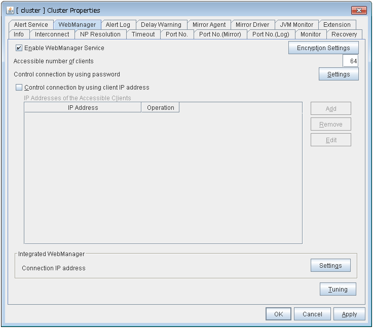 In Java Runtime Enviroment Version 9.0 or later, WebManager can be launched by using Java Web Start. When starting the Java WebManager, change "main.htm" of the URL above to "main.jnlp" and then enter the modified URL in the Address bar.Example: http://10.0.0.11:29003/main.jnlp