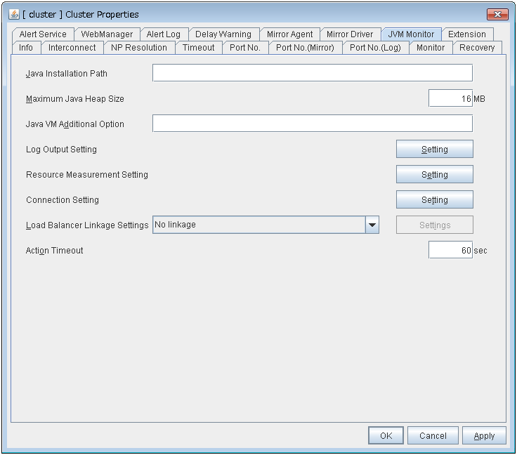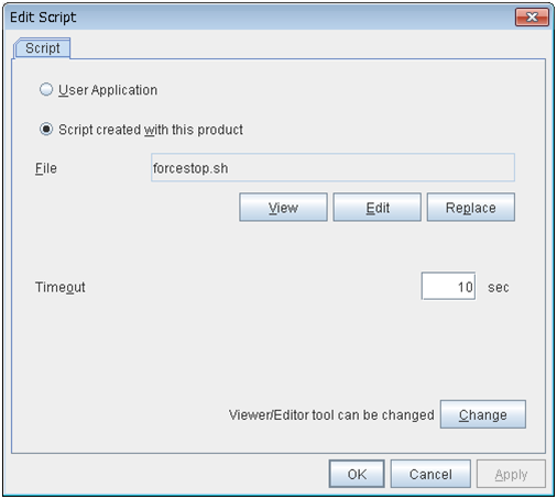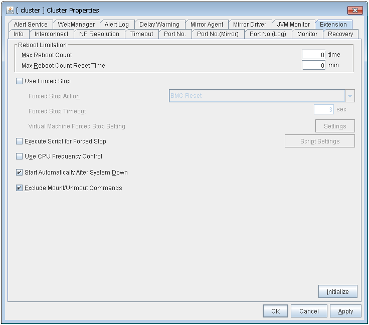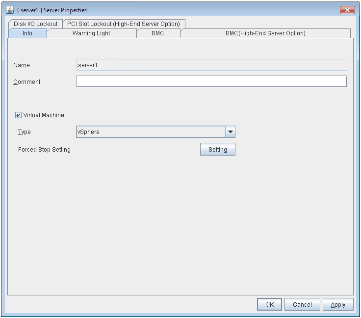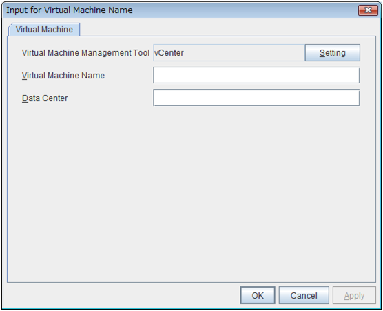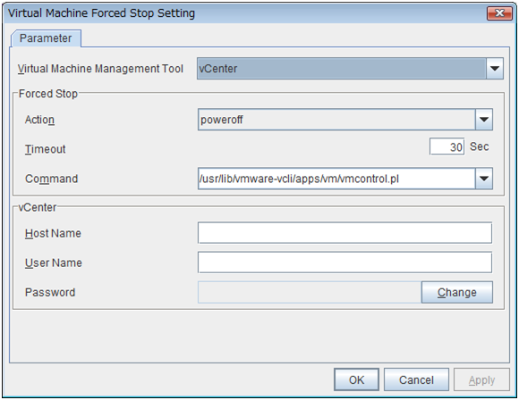 Set the vCenter server that manages the virtual machine (guest OS). Click Setting to display the Virtual Machine Forced Stop Setting dialog box.For more information on Virtual Machine Forced Stop Setting, refer to the description of the "3.11.18. Extension tab".