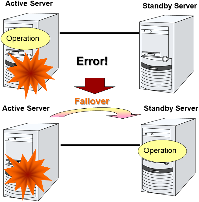 EXPRESSCLUSTER is software that enhances availability and expandability of systems by a redundant (clustered) system configuration. The application services running on the active server are automatically taken over to the standby server when an error occurs on the active server.
