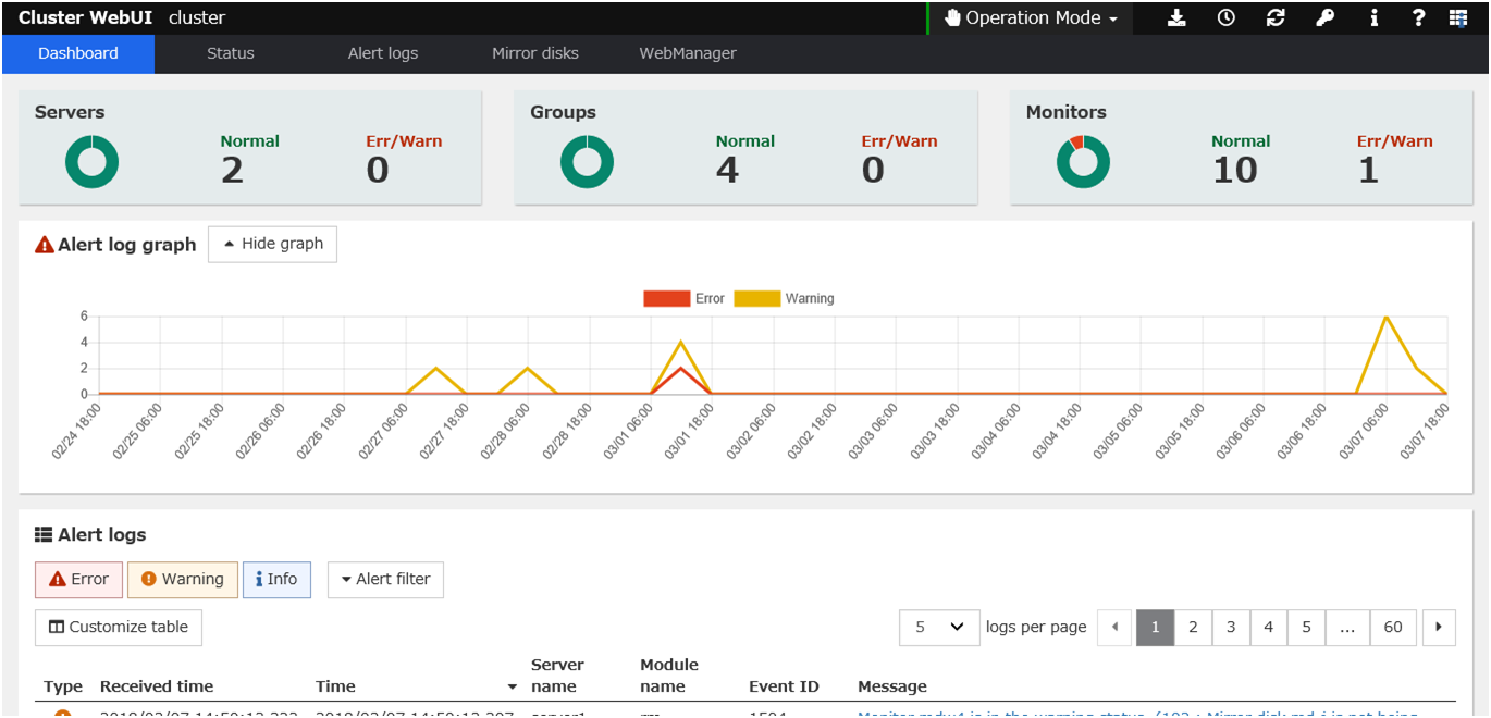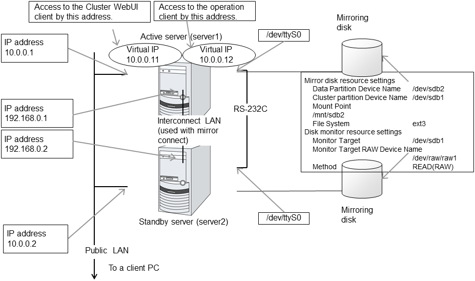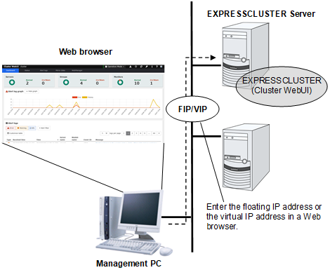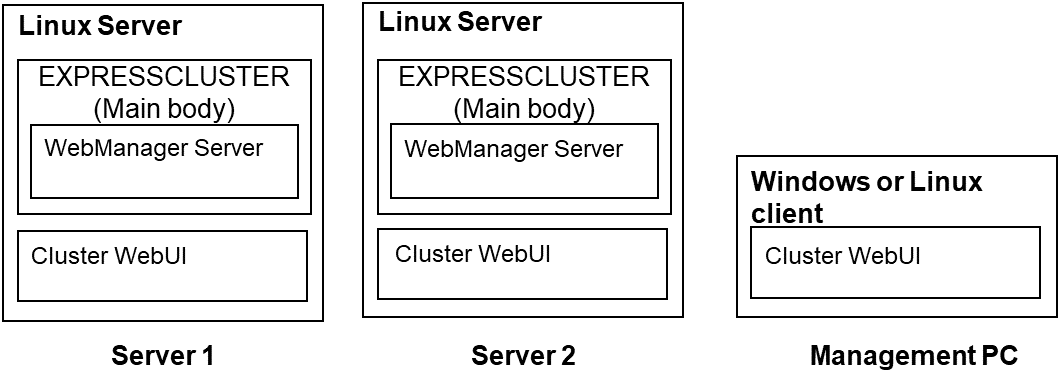 - Cluster WebUIThis is a tool to create the configuration data of EXPRESSCLUSTER and to manage EXPRESSCLUSTER operations. The Cluster WebUI is installed in EXPRESSCLUSTER Server, but it is distinguished from the EXPRESSCLUSTER Server because the Cluster WebUI is operated through a Web browser on the management PC.