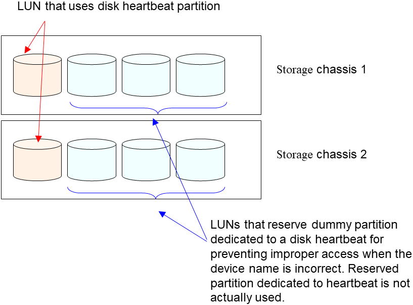 • In each LUN, allocate a partition dedicated to a disk heartbeat. LUNs that do not use a disk heartbeat should also have a dummy partition because the file system can be damaged if device names are moved due to disk failure or other causes.