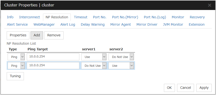 For details, see "NP Resolution tab" in "Cluster properties"in "Parameter details" in this guide.
