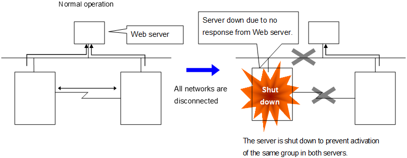 When the heartbeat from another server is detected to be stopped, the HTTP network partition resolution resource operates in the following two ways: If there is a response from Web server, it determines it as a failure of another server and executes the failover. If there is no response from Web server, it determines that the network partition status isolated the local server from the network and executes the same operation as when the network partition occurs.