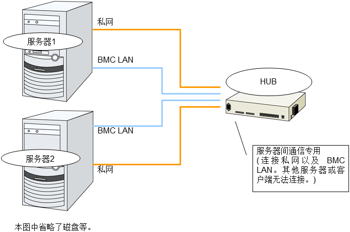 使用BMC心跳以外的BMC相关功能时,通过专用HUB连接私网和BMC的管理用LAN。