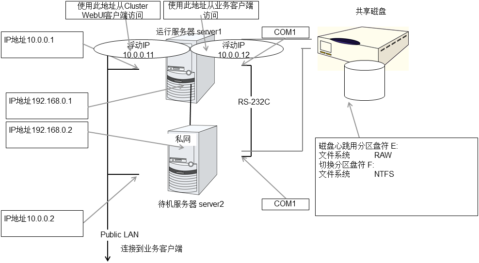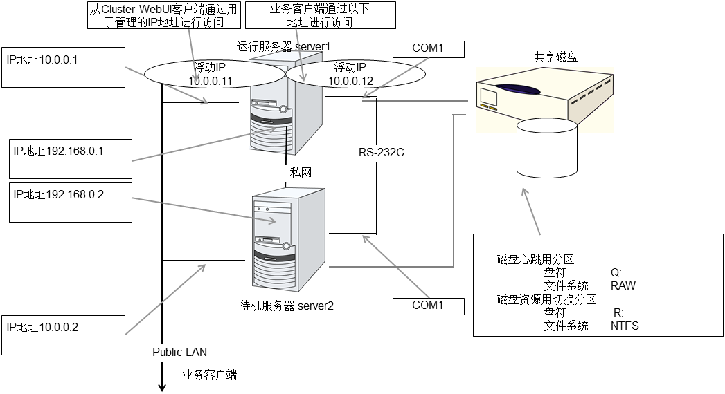确认了要构筑的集群的用途和运行形态后,再确定硬件配置。下面描述了EXPRESSCLUSTER的配置示例。