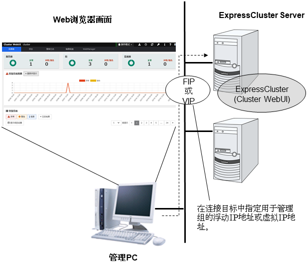 - Cluster WebUI用于EXPRESSCLUSTER的配置信息创建和操作管理的管理工具。使用Web浏览器作为用户接口。实体嵌入在EXPRESSCLUSTER本体中,但在管理终端的Web浏览器上进行操作,因此区别于EXPRESSCLUSTER本体。