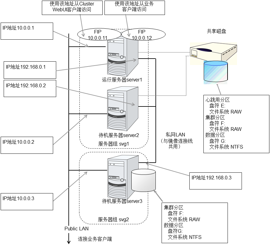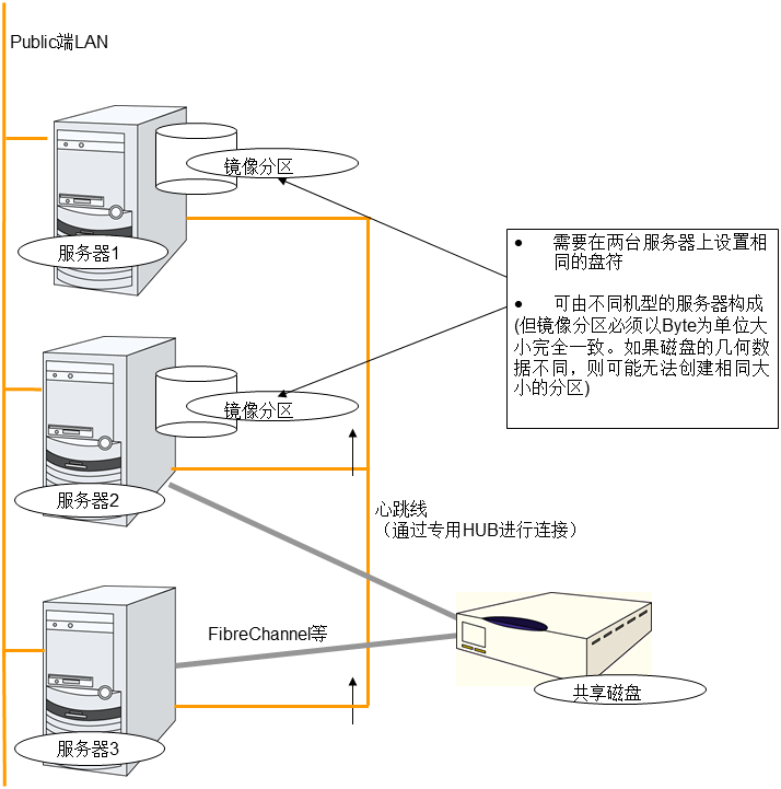 下图是由通过共享磁盘连接的2个节点和一个作为镜像化对象的磁盘的节点组成的3节点配置示例。