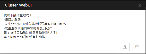 - 集群启动时,决定是自动还是手动启动失效切换组的失效切换组属性。可在管理客户端进行设置。
