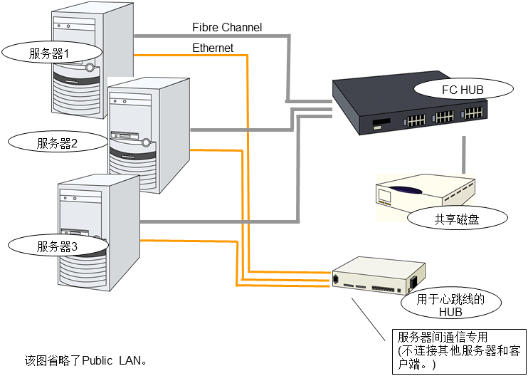 通过专用HUB连接兼作心跳线和镜像磁盘连接线的LAN。