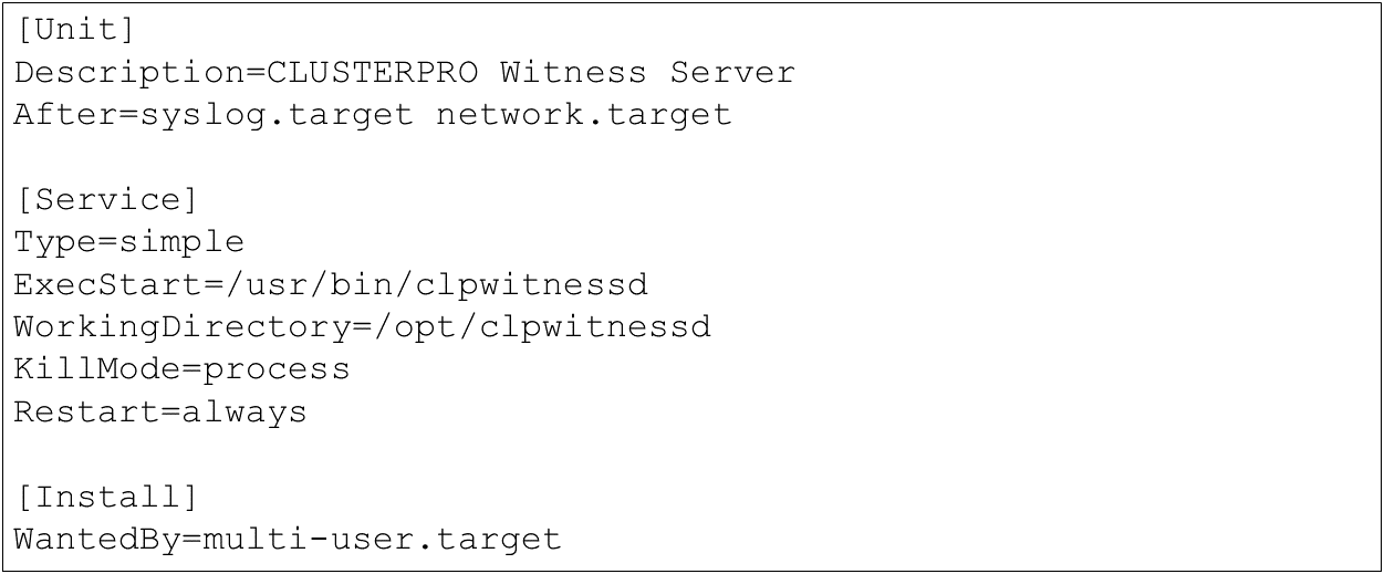 Create a directory to execute the service in any location. By default, this folder stores log files, SSL secret key file and SSL certificate file.(ex. /opt/clpwitnessd) Create the unit file of the Witness server service in /etc/systemd/system.(ex. clpwitnessd.service)Execute systemctl command to register and start the Witness server service.