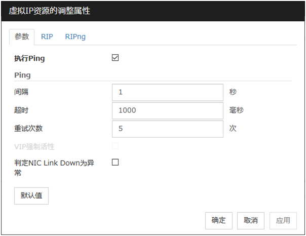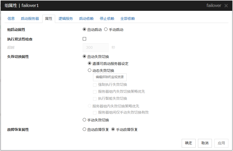 - 失效切换属性设置失效切换的方法。可设置的失效切换属性如下所示。自动失效切换心跳超时,当组资源及监视资源查出异常时,将趁机自动执行失效切换。自动失效切换时,可设定设置方法。