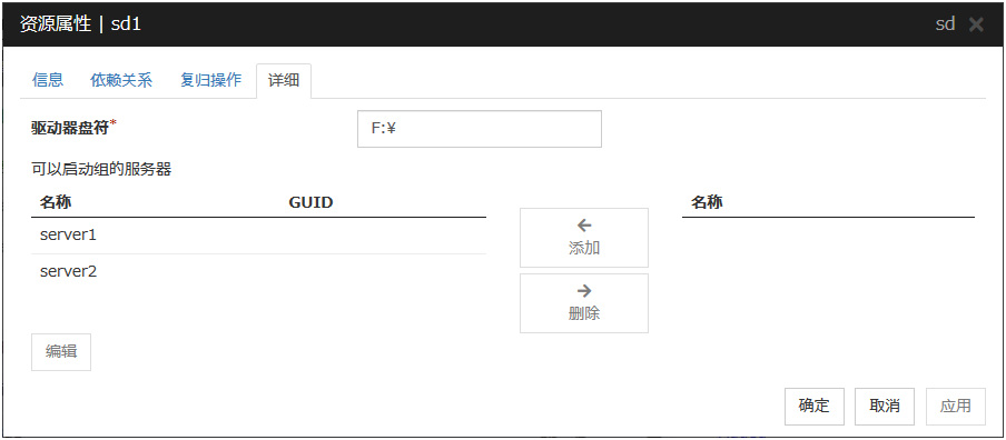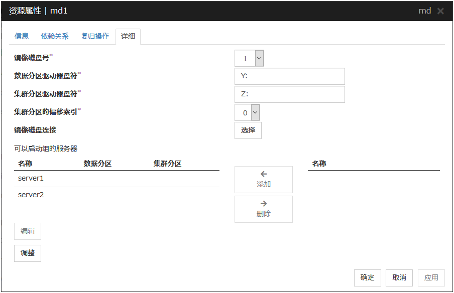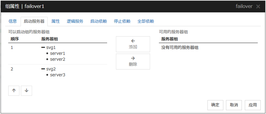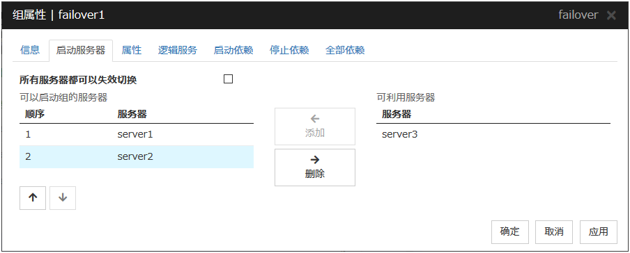 - 可启动服务器从构成集群的服务器中选择,设置能够启动组的服务器。此外,给可启动的服务器设置顺序,同时也为组的启动设置优先顺序。