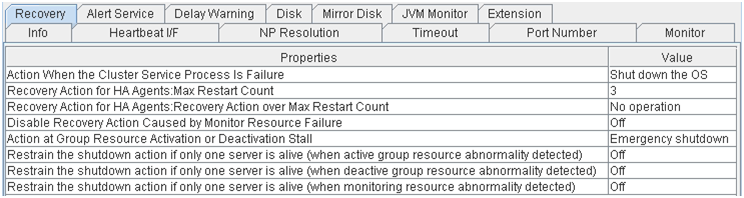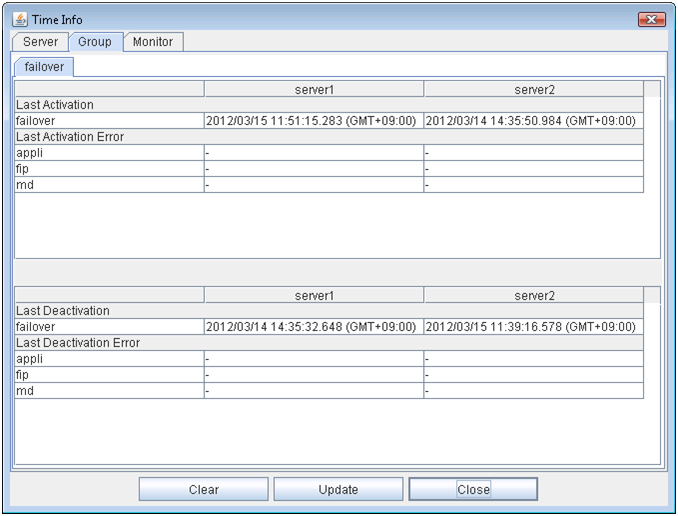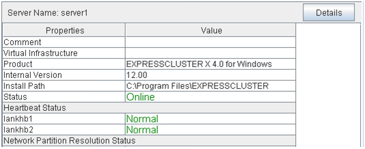 The upper part of the view provides information on each cluster resource selected in the tree view. The lower part lists the start/stop statuses and comments of each server, group resource, and monitor resource. If you click Details located on the upper right of the view, further information will be displayed in a dialog. For more information, see "2.4. Checking the cluster status by the WebManager list view".