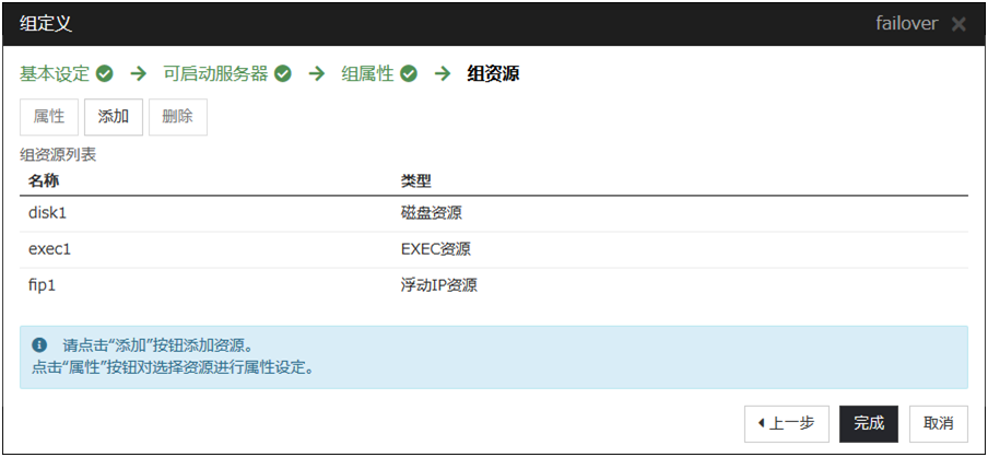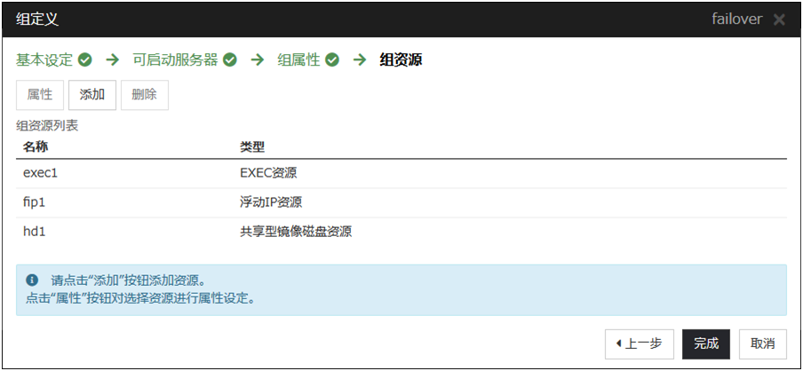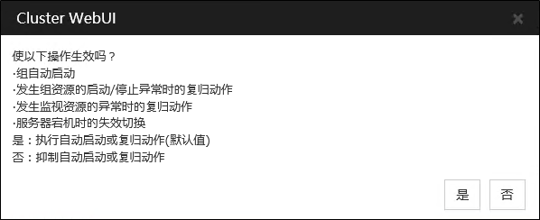 - 集群启动时,决定是自动还是手动启动失效切换组的失效切换组的属性。可在管理客户端进行设置。