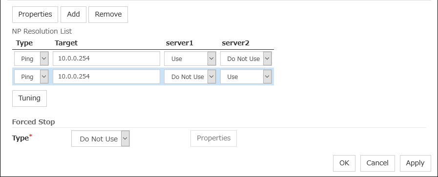 When using PING network partition resolution resource, specify addresses which can be sent from and received to through one of the interconnect LANs registered in the configuration information.