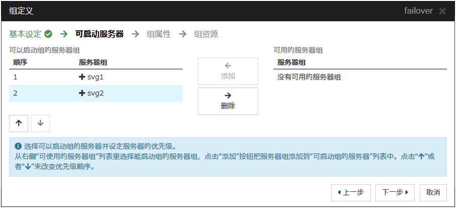 可进行失效切换的服务器列表及其列表中具有失效切换优先顺序的属性。
