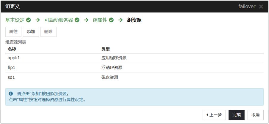 - 集群启动时,决定是自动还是手动启动失效切换组的失效切换组属性。可在管理客户端进行设置。