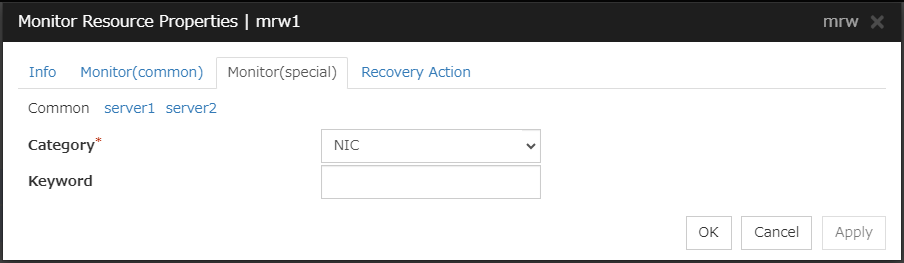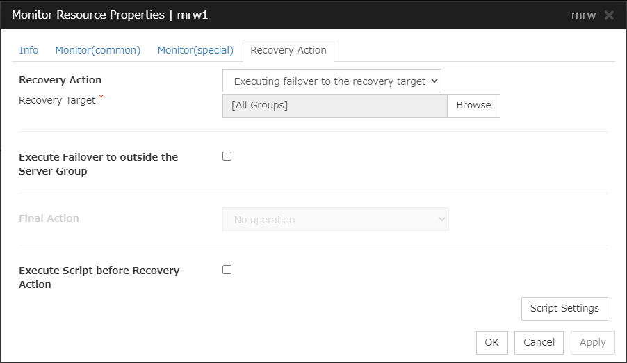 Specify the recovery target and the action upon detecting an error. For external link monitor resources, select "Restart the recovery target", " Executing failover to the recovery target", or " Execute the final action" as the action to take when an error is detected. However, if the recovery target is inactive, the recovery action is not performed.