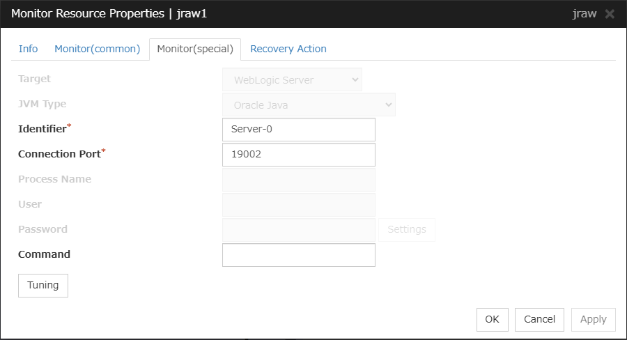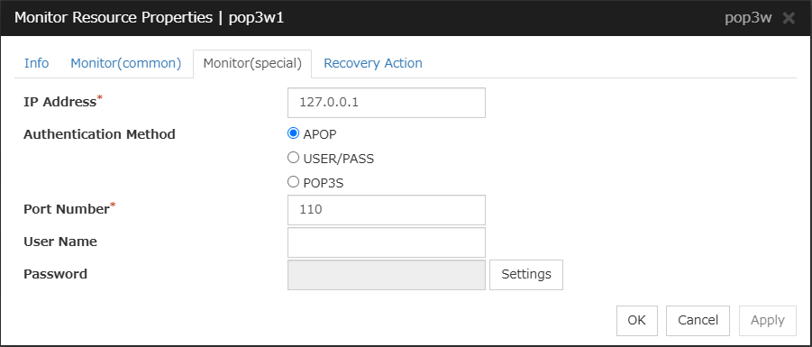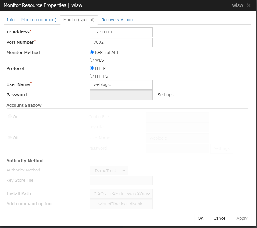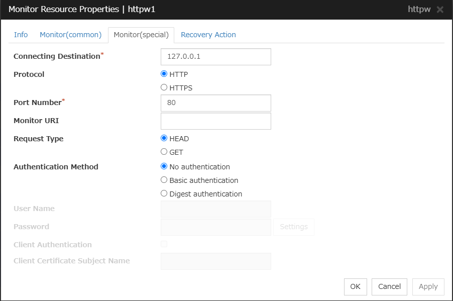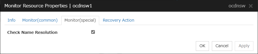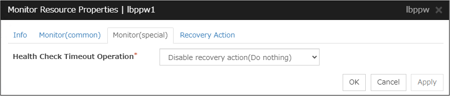 Select Disable recovery action(Do nothing) if you think this error is CLI command failure (a monitoring target itself is in normal status) and no action needs to be taken. This option is recommended as still error detection can find errors, for example when troubles are found in IP addresses.