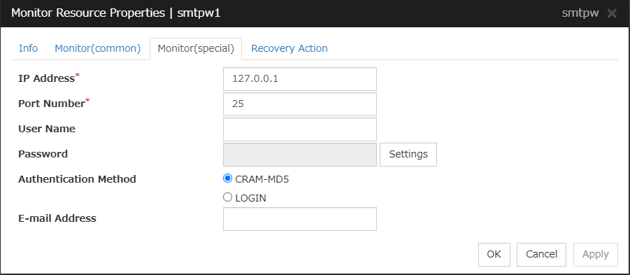 If no actions are to be taken, because the failure of the AWS CLI command does not mean an error in the monitoring target, it is recommended to select Disable recovery action(Do nothing). Even in this case, you can detect an error in failing to check the health of a registered IP address.