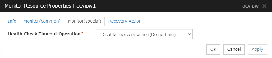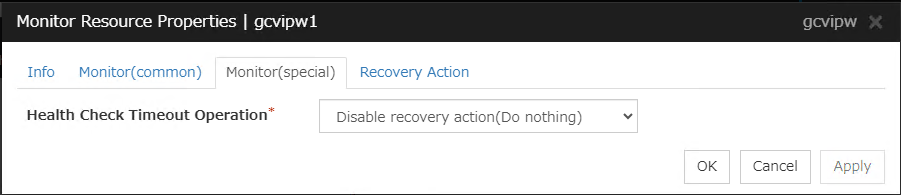 Select Disable recovery action(Do nothing) if you think this error is CLI command failure (a monitoring target itself is in normal status) and no action needs to be taken. This option is recommended as still error detection can find EIP error (e.g. no EIP is found).
