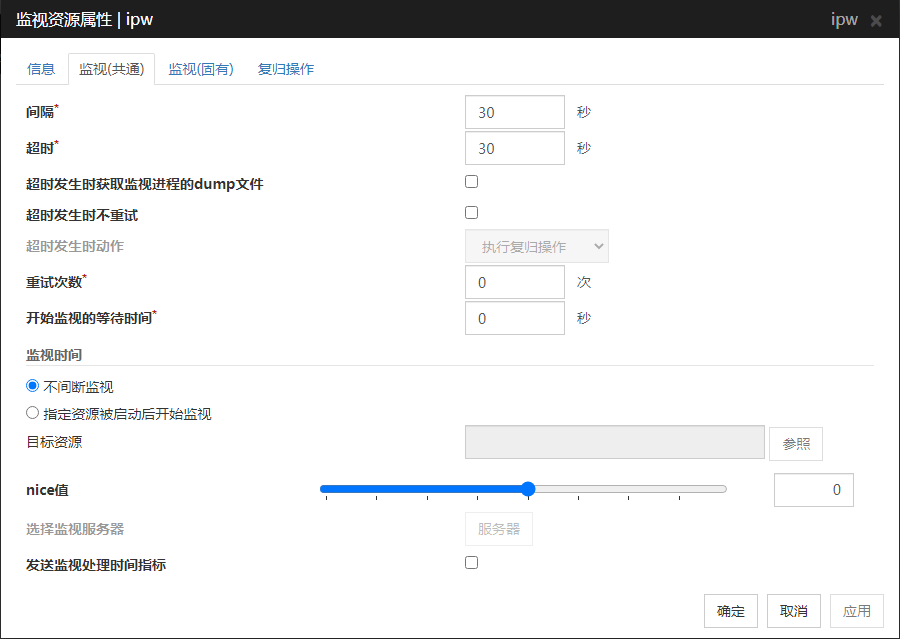 - 将延迟警告比例设置为0时每次执行监视都会通报延迟警告。可利用该功能计算出服务器在高负载状态下监视资源的监视时间,从而决定监视资源的监视超时时间