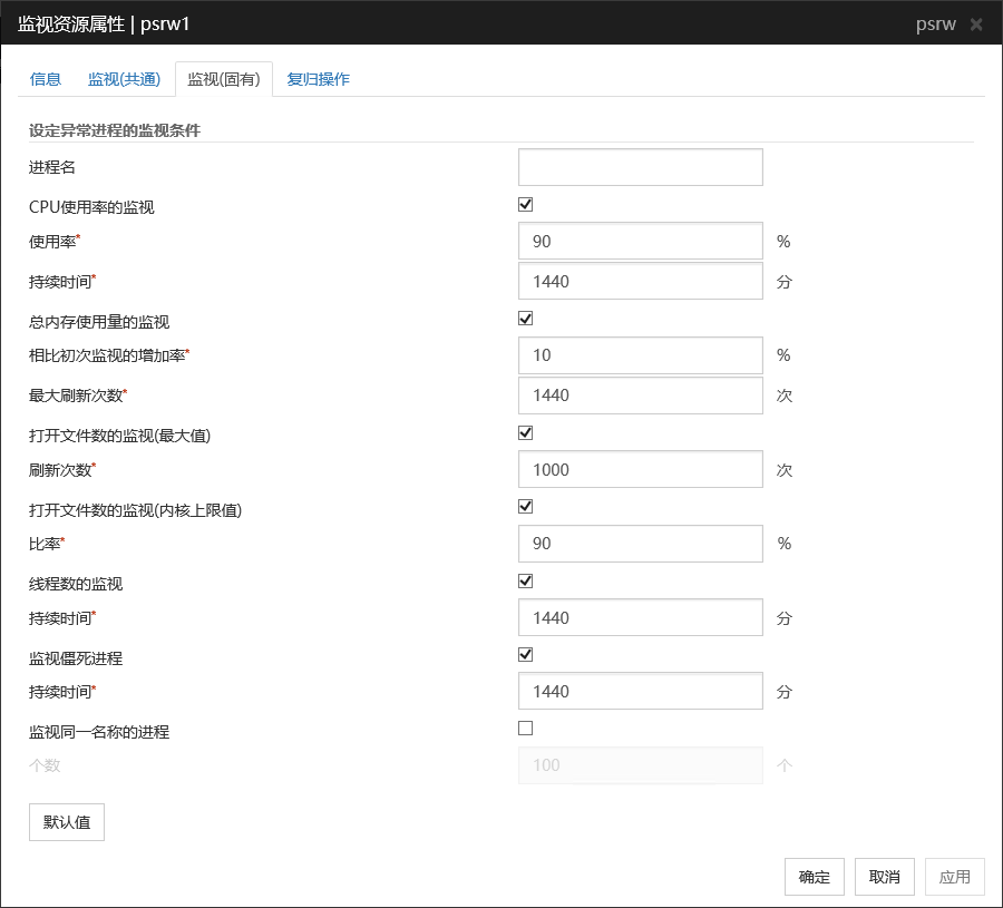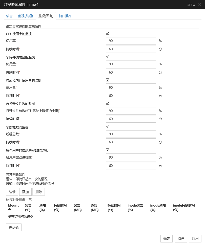 - 资源监视器的监测模式System Resource Agent通过「最多次数」和「监视持续时间」两个参数的组合进行检测。通过继续收集各系统资源(打开文件数,用户访问数,线程数,内存使用量,CPU 使用率,虚拟内存使用量),当一定时间内(指定为持续时间的时间)超过最多次数时,就会检测出异常。